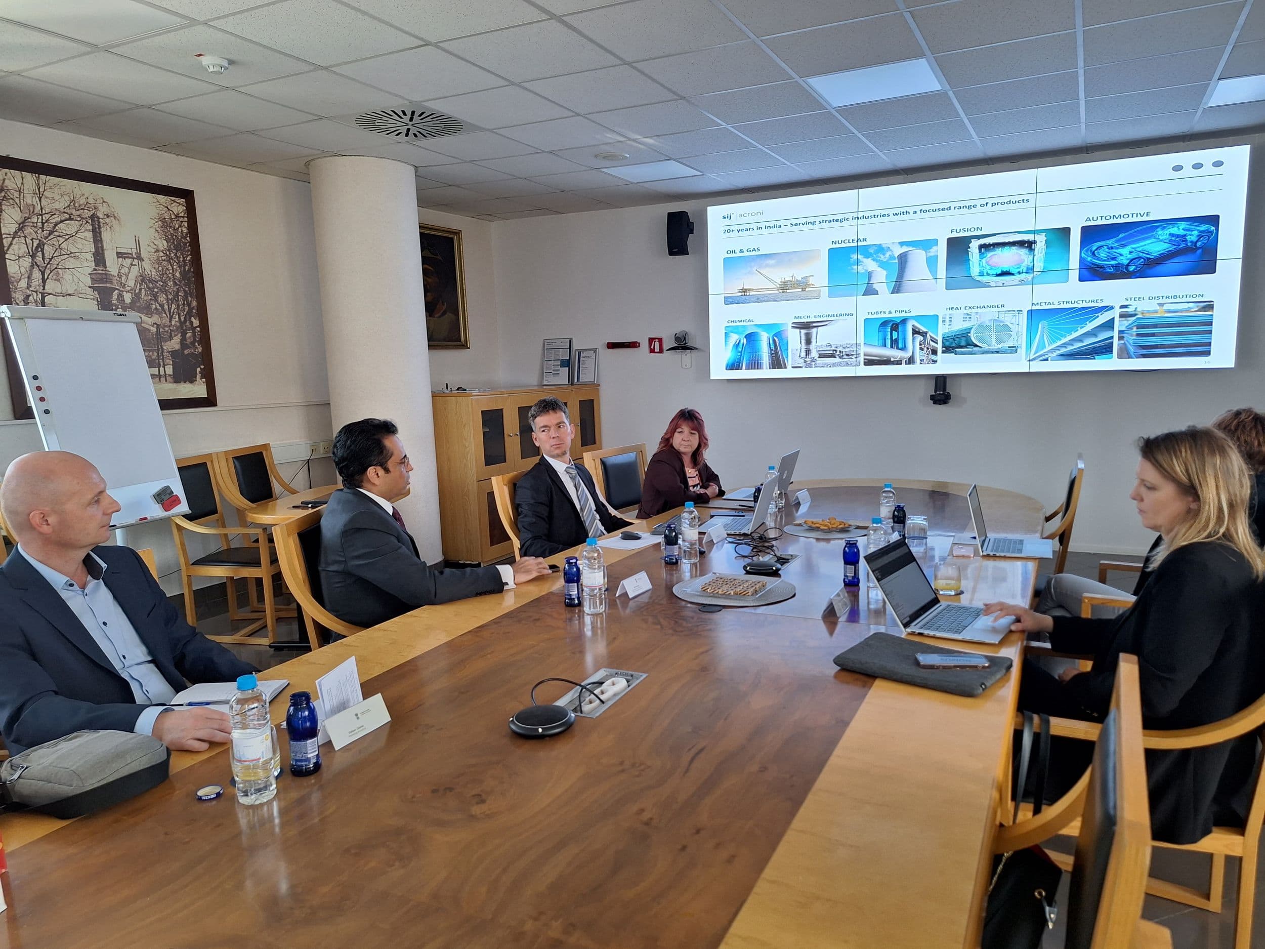 Ker je SIJ Acroni oziroma Skupina SIJ kot celota relativno manjše podjetje v svetovnem merilu jeklarske industrije, se prav zato lahko hitro in fleksibilno odziva na potrebe trga, s svojim znanjem in strokovnostjo kupcem pa zagotavlja rešitve tudi za najzahtevnejše aplikacije.Z veleposlanikom smo se pogovarjali o prisotnosti na indijskem trgu, kjer že imamo kupce, kar predstavlja dobro osnovo za nadaljnjo rast in poglabljanje sodelovanja. Predstavili smo mu potencial, ki ga vidimo na indijskem trgu, predvsem na področju neorientiranih elektropločevin (NO) za transformacijo vozil iz klasičnih pogonov na električne, v energetskem sektorju (oil & gas, LNG in jedrska energija), pri t. i. »yellow goods«, vesoljskih aplikacijah ter pri specialnih pločevinah za tlačne posode (pressure vessel grade).